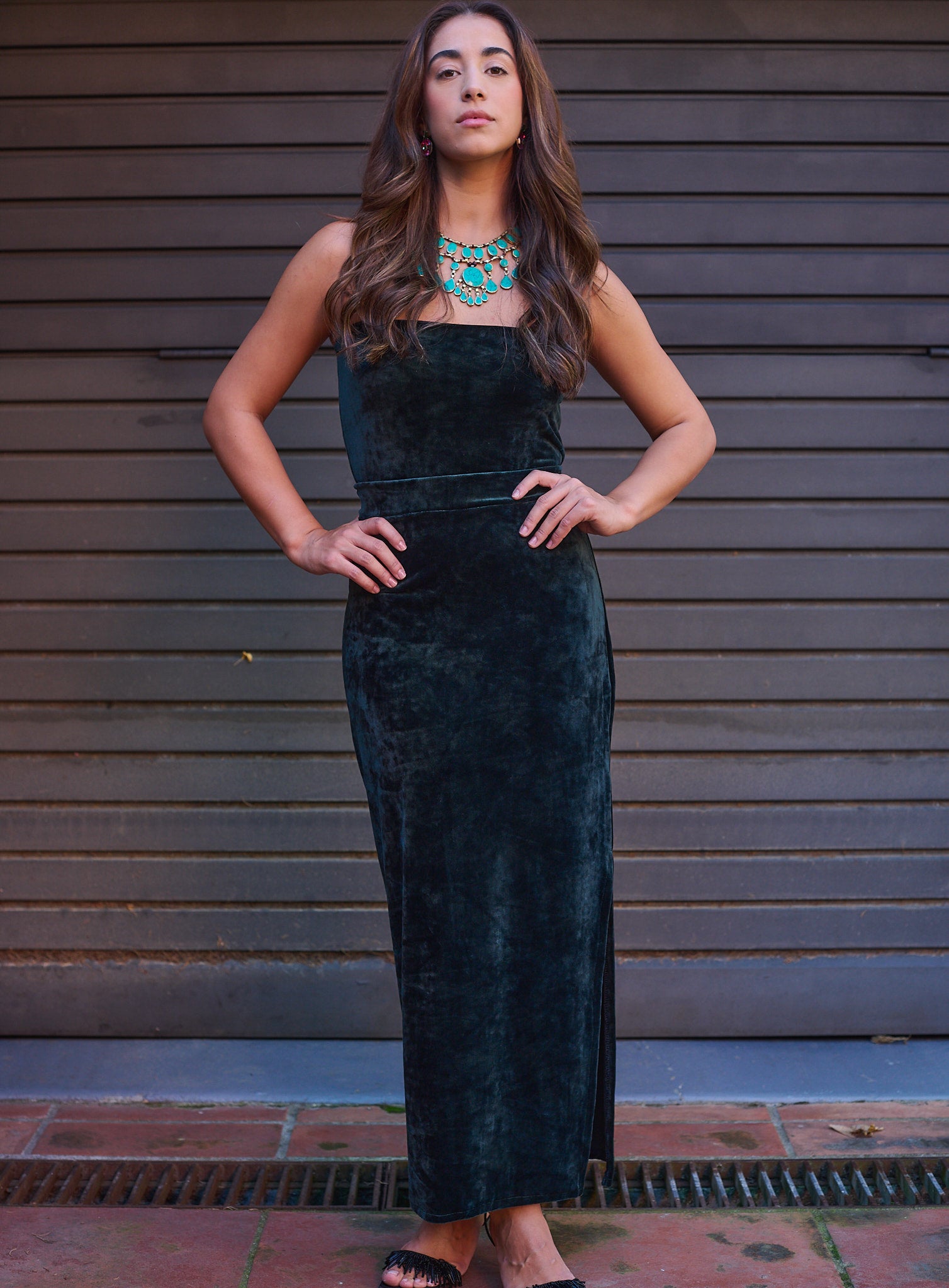 Long velvet skirt with side slit above the knee.