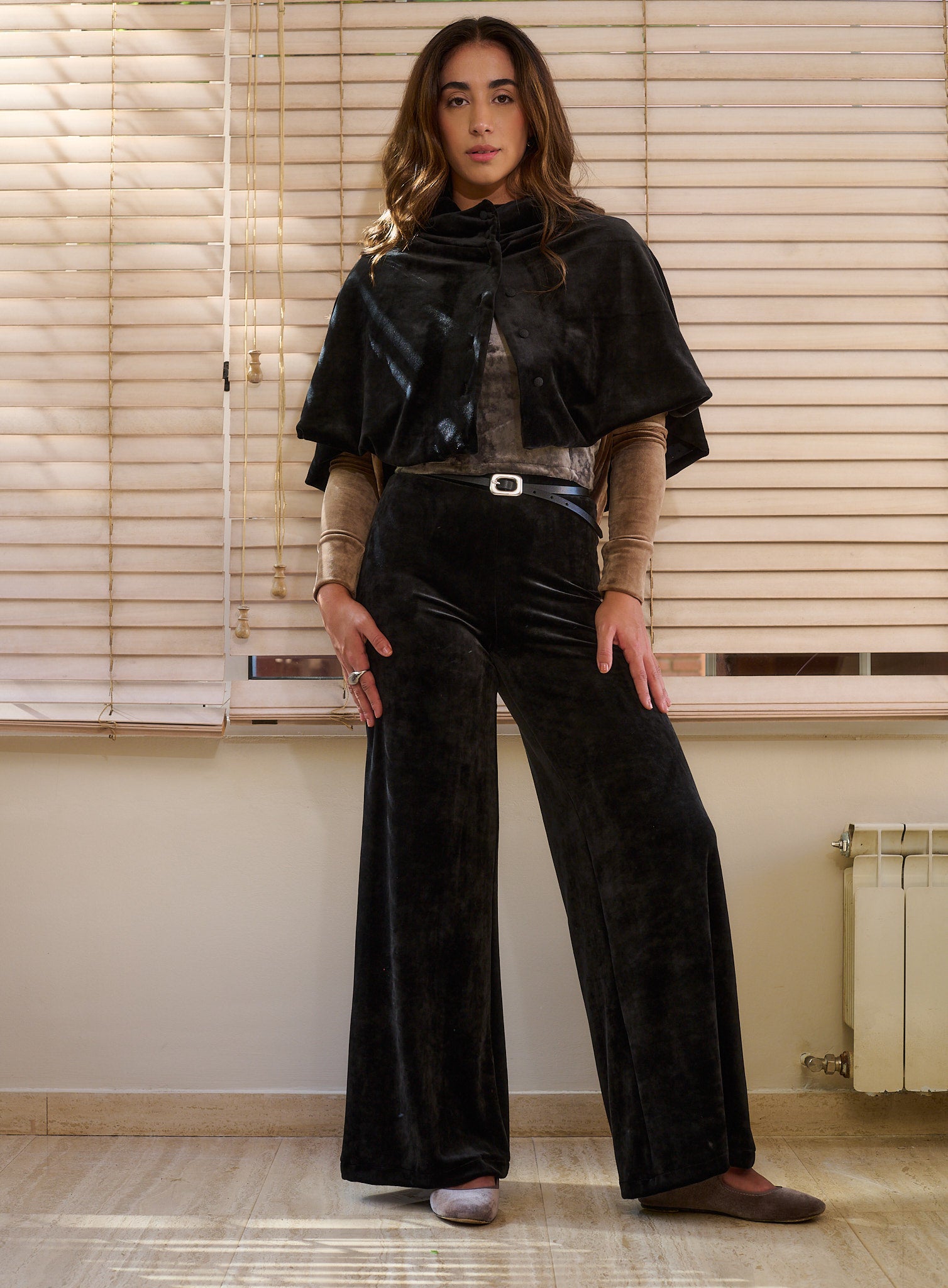 - Pantalones anchos palazzo de tiro alto en terciopelo elástico que se adaptan a tu figura.